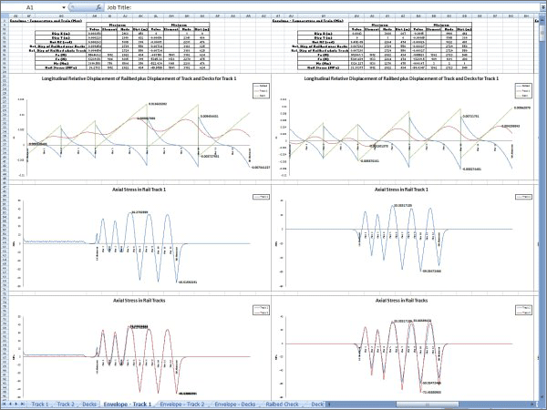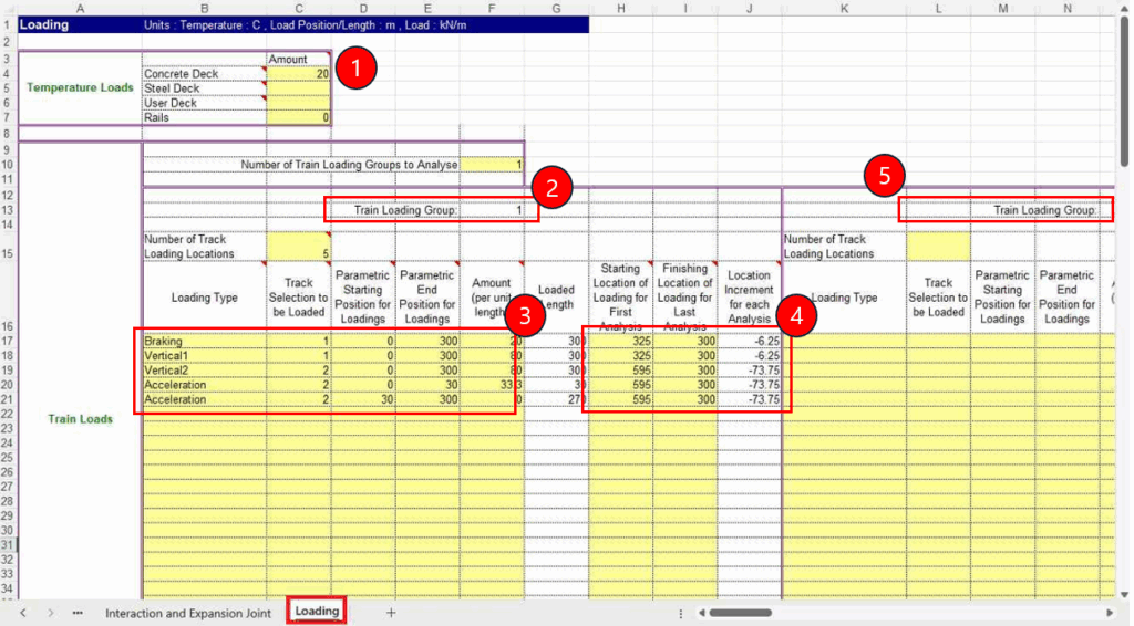 궤도-교량 상호작용의 모델은 Excel Spreadsheet에서 입력한 기하특성, 재료특성, 하중 데이터 등을 이용하여 LUSAS에서 자동으로 구성됩니다. 온도하중과 열차 하중을 포함한 여러개의 차량하중 역시 하나의 Excel spreadsheet에서 모두 정의할 수 있습니다.