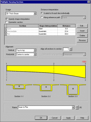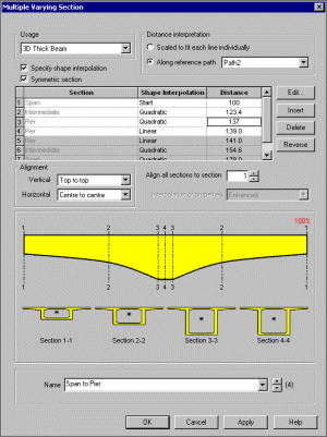 LUSAS의 Multiple varying section 기능을 사용하여 Deck 뿐만아니라 Span의 단면변화까지 해석모델에 적용할 수 있습니다.